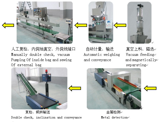 4、Metal detector and electronic dynamic reexamination scale can monitor goods on the automatic packing line, improve the efficiency and guarantee the correct and safe warehousing of products.